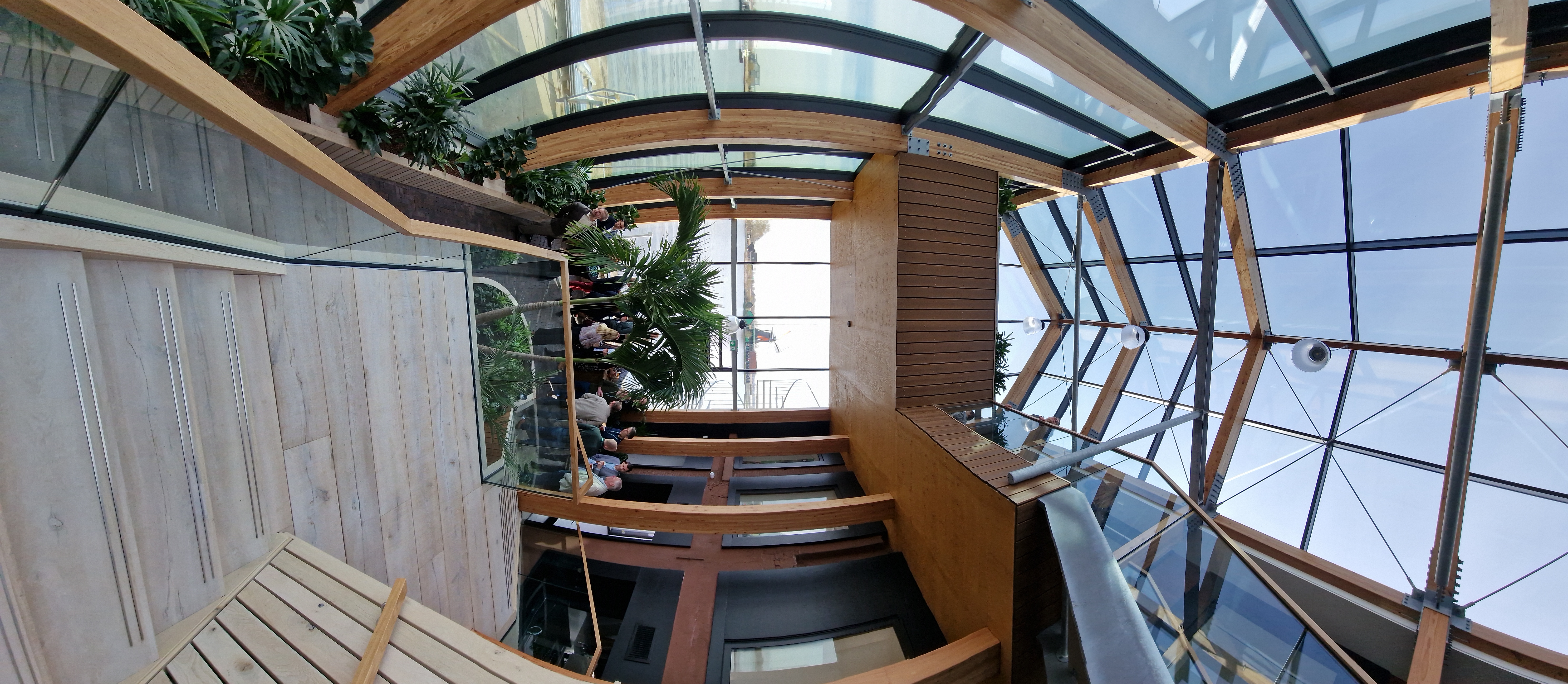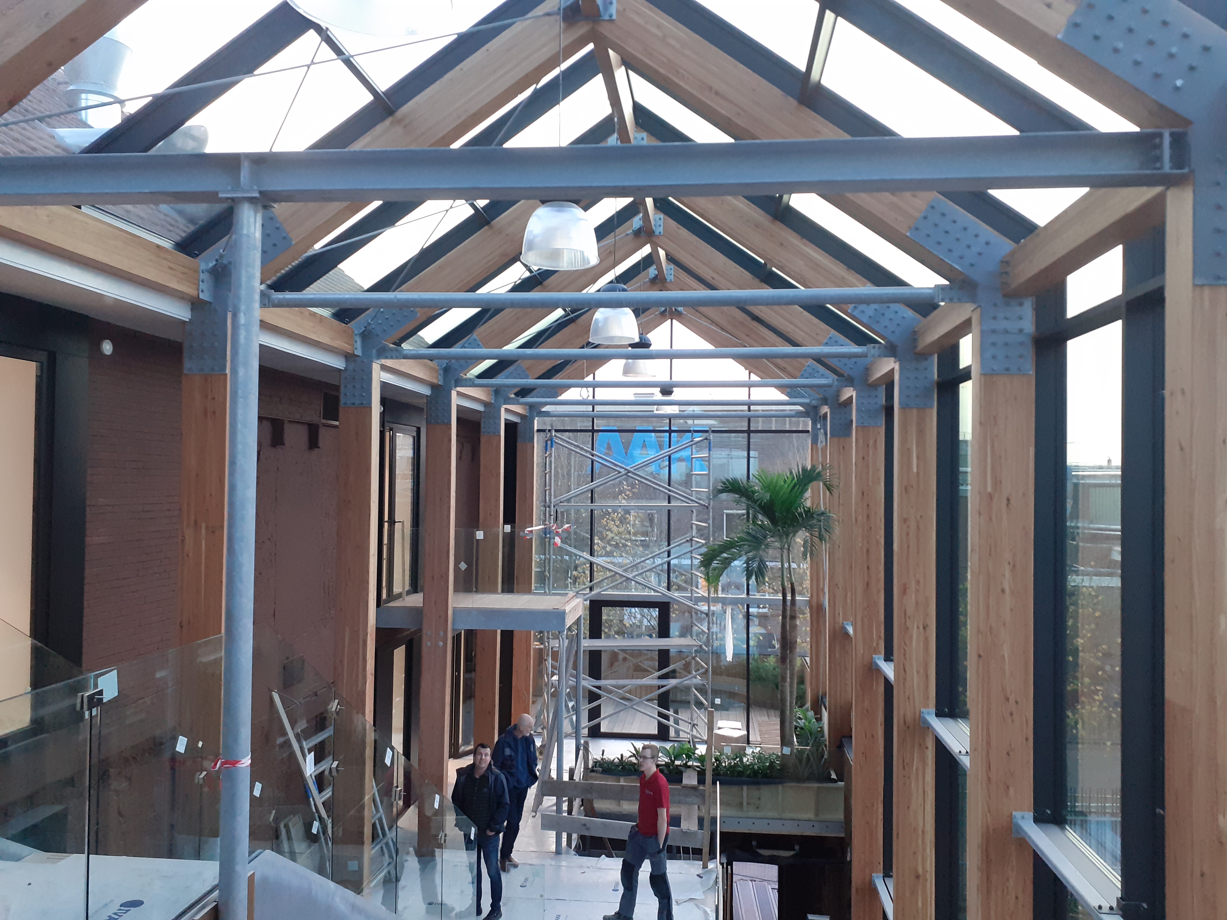 Naast het pakhuis is een glazen ontvangst- en presentatieruimte gerealiseerd. Alle houten betimmeringen zijn in onze Timmerfabriek in Leusden geprefabriceerd.